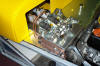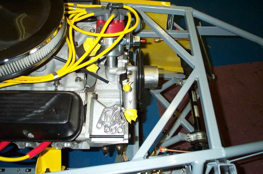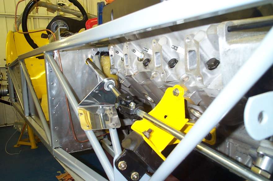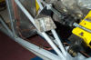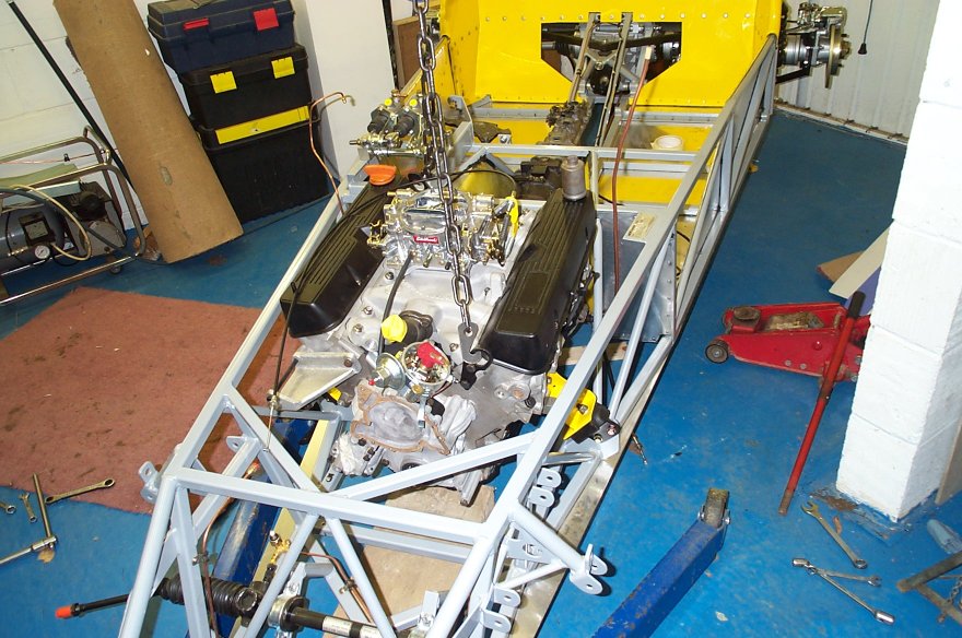 Not much done this week with Christmas celebrations but I did collect the gearbox from “Gearboxman” on Monday and got it bolted to the engine. On Saturday my friend Tim came round and gave me hand to put the engine in. We moved the car around enough to enable us to get access for the engine crane, dropped the front so it was resting on a piece of wood on the garage floor and after removing the water pump and bottom pulley maneuvered the engine into the correct position, it was very tight but there was no major problem getting it in. Once in place it became apparent that the o/s/r of the gearbox was hard against the fiberglass side panel, time to stop for lunch. After the break we decided to remove the triangular bracket supplied by Dax that bolts between the gearbox and the rubber mounting with a view to elongating the hole for the rubber mounting thus enabling the gearbox to be moved into the correct position. Close inspection of the bracket revealed that the mounting hole was offset and we had got it the wrong way round, I decided to elongate the hole a small amount as well for good luck so we would be sure to be able to get it in the correct position. This worked and we were able to get the gearbox in the correct position. Thanks to Tim Hoverds build diary we had removed a small amount of the lug on the gearbox that would hit the chassis on the near side before we put the engine in so the gearbox has a couple of millimeters clearance each side. |