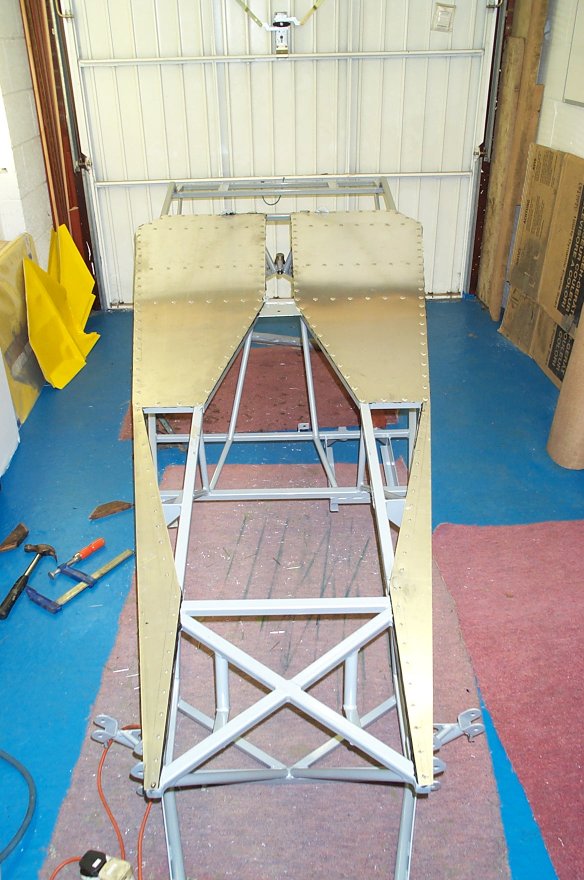 Fitted the floor panels and infill panels, perhaps used a little too much Wurth but I prefer too much to not enough. The pneumatic pop rivet gun made light work of the riveting, in fact it was so easy I thought it was not working properly! Then turned the chassis over and fitted the diff after spending a little time working out the washers. I left the chassis on the floor to fit the diff so I did not have to lift it up (the diff), fitted the top bolts, then the back bolts then the front ones this had the diff fitted in about 15 minutes. I then lifted the chassis on to axle stands and fitted the De-Dion tube, A frame, radius arms and dampers. |