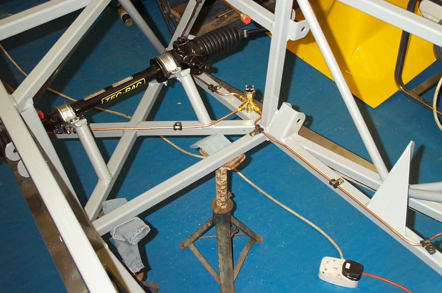 A visit to Dax during the week allowed me to acquire a heater, a radiator, a header tank and a hose kit, looks like the cooling system is next on the agenda. Before I started on this the cover to the pedal box was finished (now that I was certain of where the pedals final position was) and fitted with the foot well top covers. As usual I seemed to get more “black death” where it should not be than in the right place, still it seems to come of your hands after a few days. The Radiator was next, but this proved to be not a simple as it first seemed, the build manual says “Position the radiator laterally so that it is central between side chassis rails (no problem here) and vertically, so that the top hose will just pass over the upper chassis rail” that also seemed quite simple, so it was fitted. Thought I better try the nose cone, so that was rescued from the shed and put roughly in the correct place, but what’s this, it hits the bottom header tank, time to stop for lunch and check a few build diary’s. A quick check of Trevor’s and Tim’s site showed their radiators to be nearly 2 inches higher than mine was! After lunch the radiator was raised the required amount, the nose cone now fits and it looks like I may even be able to connect the bottom hose. I purchased the hose kit from Dax that is for an injection V8 and mine is a carb version with a P6 front end (a bit more compact) so I expected a few problem making the hoses fit, but after some “adjusting” of rubber hoses I managed to get the bottom hose sorted. I was not sure about the top hose yet as the picture of Trevor’s car does not appear to have a vent (it is the highest point of the system) so I will have to contact him and see if it is necessary. Nothing for it now but to finish off the metal brake pipes to the master cylinders. These really try my patience and never seem to be completely straight.