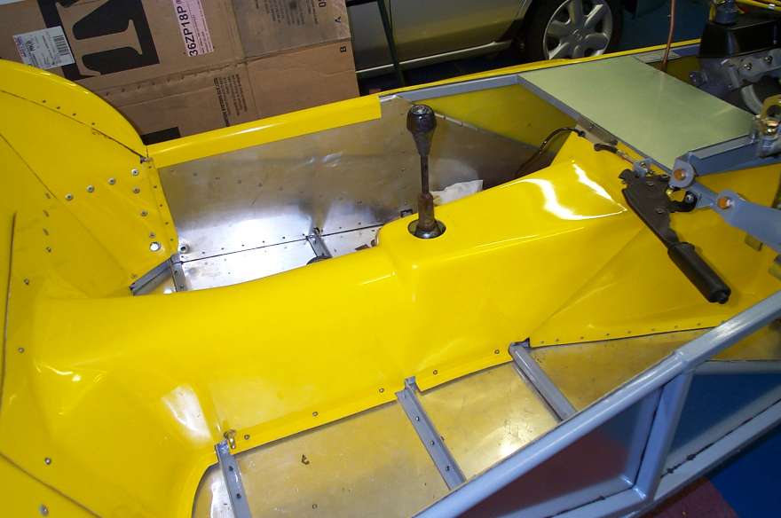 More celebrations this week and some very cold weather but managed to get the transmission tunnel fitted, this was quite tricky as it fits in a “V” so finding the right bits to trim involved a lot of trial fitting after removing small amounts. On the off side the flange is almost touching the floor but it is slightly higher on the near side as I felt that unless I removed the flange that sat on the diagonal it would go no lower and I was not prepared to do that. I may well remove most of the flange if it gets in the way of fitting the carpet later. A small piece of aluminum was made to allow the rear harness and the handbrake cable to enter the cockpit and not be disturbed when the tunnel is removed. |
