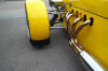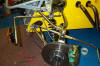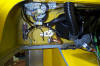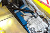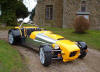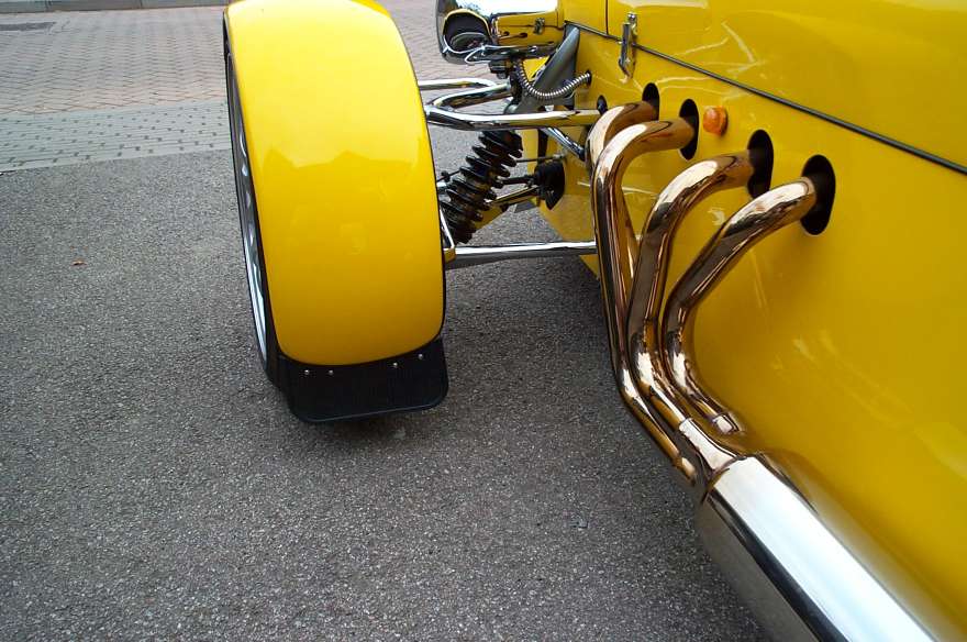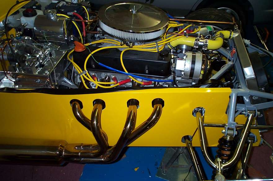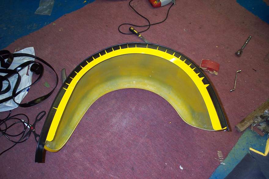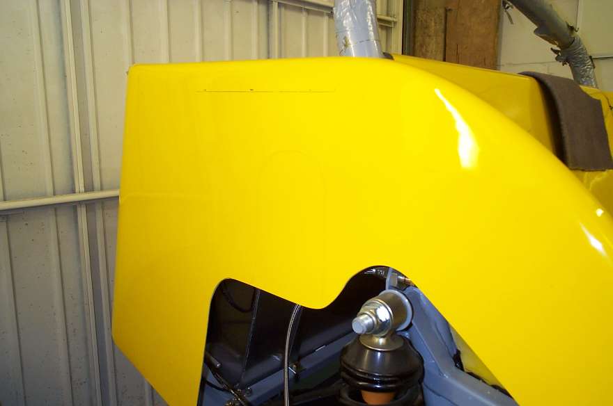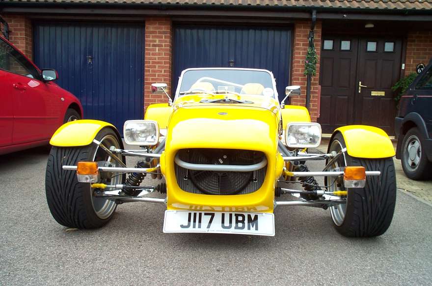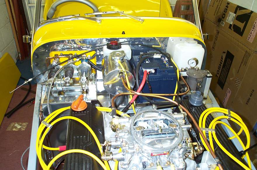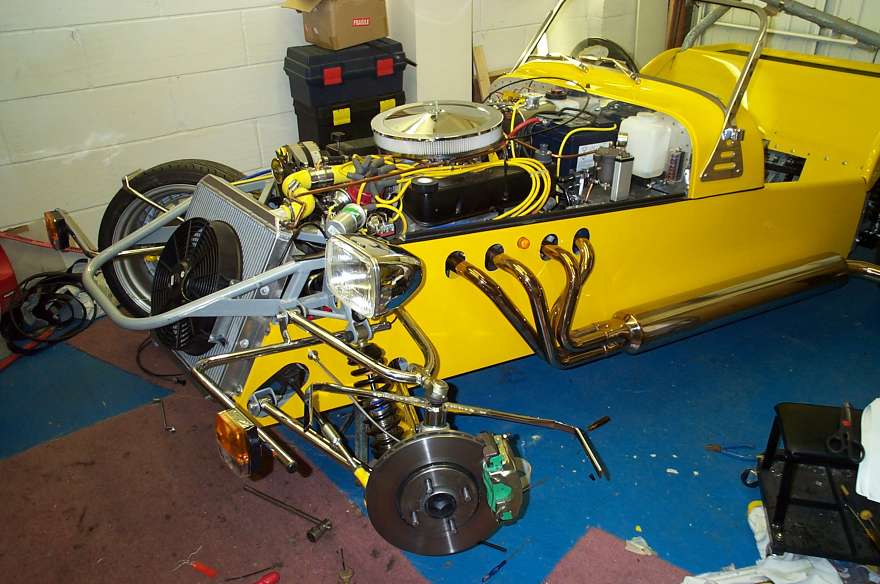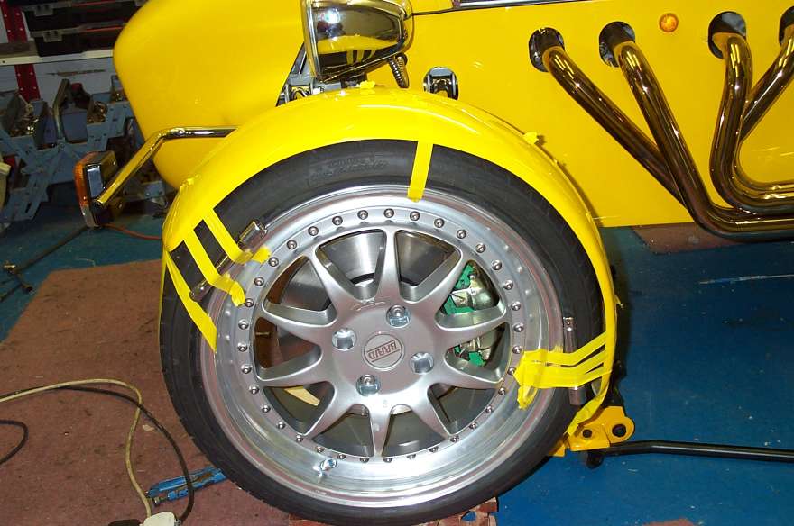 During the week I got the front brake hoses fitted and the off side headlamp and repeater lamp fitted and connect so I was ready to fit the nose cone, this was fitted as far back as I could get it which meant that the front bolt heads for the upper wishbone were just about covered. Now the moment of truth, the bonnet was taken out of the shed where it had been stored out of harms way and a hole just big enough for the carb was cut so I could trial fit it. The fit seemed ok, a small gap front and rear of the bonnet, but I had not fitted the rubber seal and this would take up some space. The nose cone was bolted in place, I have only used one bolt at each side in the flange as they are very difficult to get too, I had to remove the alternator to fit the off side, and was worried if I would be able to refit it with the nose in place but was just able to do it with a few grazed knuckles Front mudguards were tackled next, the manual suggests that some nuts are used to space the mudguard away from the tyre between the tyres, these were duly taped into position, the stays attacked with the angle grinder to remove the chrome plating and mudguards roughed up with the corner of a file. Black Death was applied to the stays and the mudguards put into place and held with lots of strips of insulation and left till the morning. In the morning the tape was removed, the wheel taken off and more Black Death applied to fill the gaps and encase the stays. This seemed to work quite well and the other side was done in the evening. The came round on Sunday so I roped him into giving me a hand bleeding the brakes and clutch, the clutch bleed fine although I had to remove the slave cylinder and hold it in a vertical position with the bleed nipple at the top to get all the air out. The brakes however were a lot more fun, despite my note on the white board to remind me to tighten up the hose to the rear calipers, I forgot, so there was brake fluid all over the floor! Every hose to caliper connection proved difficult to seal. With hindsight I should have assembled them with brake fluid as a lubricant and they would have tightened up much better. Also one of the master cylinder connections proved to be very difficult to get sealed. After some hours everything was working fine and my front mounted brake switch had not caused a problem. I had taken Monday off work so the day was spent fitting the rear mudguards, I first stuck the beading round the rear wheel arch as I felt that I would not easily be able to fit as I attached it and it would protect the tub from damage as I trial; fitted it. The front couple of bolts were attached to the chassis, the rest were bolted through the tub with large “penny” washers each side. I set the rear wheel arches 30mm down from the top of the tub rather than the 35mm it says in the build manual as many people seem to have had problems with tyres rubbing, and I set them as far foreword as they could go. (500 miles later this seems fine and I have not had any problems with them). |