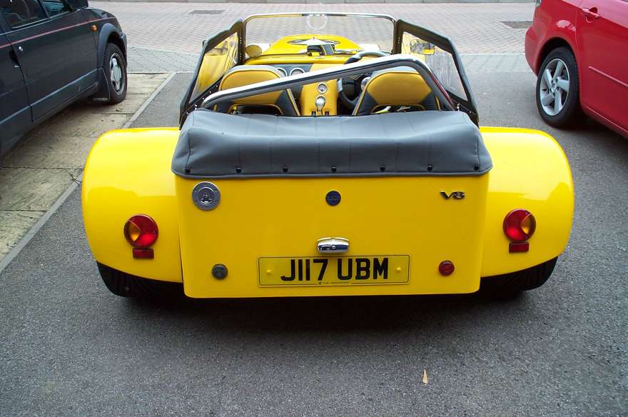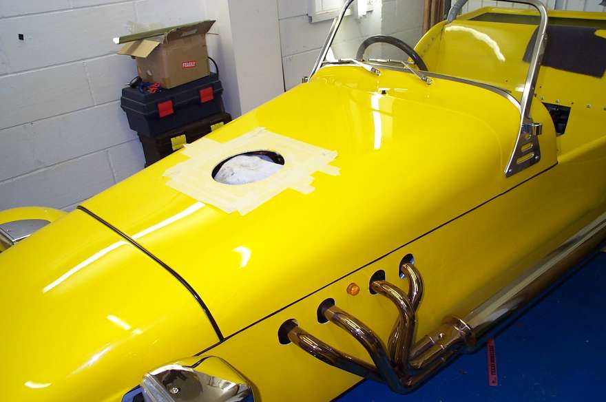 The target this week was to get the car in a condition that would enable me to drive to work to bed things in a bit, and get an MOT. The bonnet was fitted, this was just a bit fiddly attaching the hinges, once it was fitted the hole was marked for the air filter and duly cut with a jig saw, I had made it a bit small so I had to go round again to make it a bit bigger, better that way than to have made it too big I suppose. I had to go on a training course on Thursday which messed my plans up a bit, it also meant that I would have to go into work and borrow a set of trade plates to bring the car in. The car made the 28 miles to work without problem, but then the boss decided to call a meeting because I had been away the day before when the meeting was originally planed! No chance of a MOT today then, but the car got me home ok and I still had the trade plates for brake testing on Saturday. My son was had a day off work so we went to the local industrial estate which was deserted at the weekend and preceded to try and set up the balance bar, we could not get the nearside front wheel to lock up despite smoke coming off the off side one, time to check things over back home! Now last time I played around with brakes sliding calipers were not in general use, what I found was that I had not cleaned up properly the caliper carrier that the brake pad rests on, which caused it to stick. This was duly cleaned up, the brakes now worked correctly, and the correct position on the balance bar found with the fronts locking up just before the rear. But most of the day had been taken up with sorting the brakes out. Not much time left to get rid of any sharp edges and fit the SVA specific parts like bonnet catch covers, extra bar in the nose cone and all the bolt covers. |