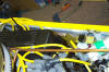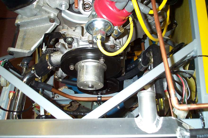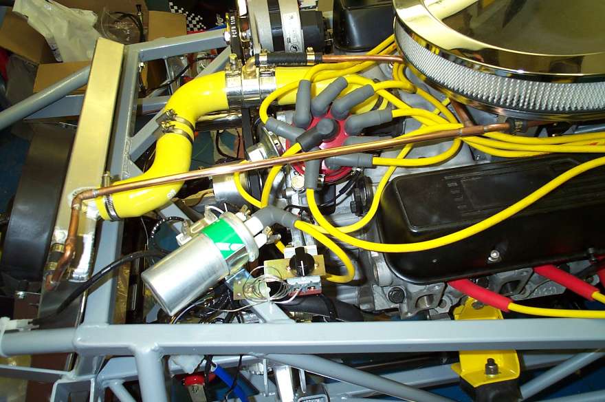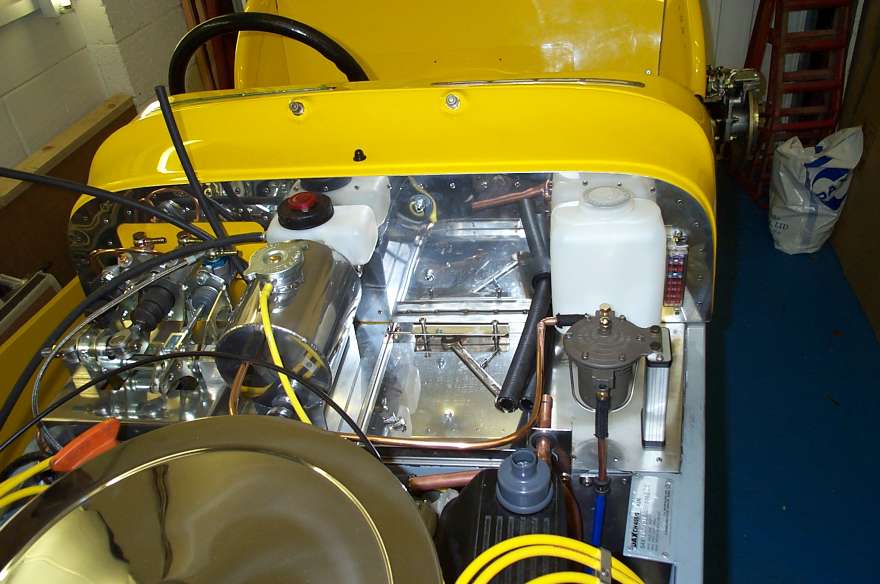Pipe work this week, the feed and return pipes for the remote filter were cut to the correct length and a clamp made up to hold the two pipes together as neatly as possible, all looks good but can’t tell for sure until the engine is working, must remember to buy some clamps for the hoses before I start the engine. Next was the vent pipe for the cooling system, this should help stop air locks (I hope!) in the top hose, so with some 8mm copper pipe left over from the fuel feed and some elbows and a “T” piece a pipe was fabricated that slopes from the radiator to the header tank, I can’t connect the top hose vent to it yet as the hoses have not arrived. Just to brighten things up I cut a piece of the yellow silicone small bore pipe I had left over from the distributor vacuum advance for the header tank overflow. I am using Dax’s metal bottom hose that has an outlet for the heater return in, this keeps the pipe lower down and more out of the way from the crowded top of the engine and I can’t easily run a pipe under the inlet manifold as I am using the very low Offenhauser manifold. So while I was playing with copper pipe I bent a piece of 15mm pipe for the first section of the return pipe that sits on the lower chassis rail, I haven’t decided where the heater pipes should enter through the scuttle panel yet so I can’t finish the pipes off, I will have to get the battery tray and washer bottle and see where the space is left.