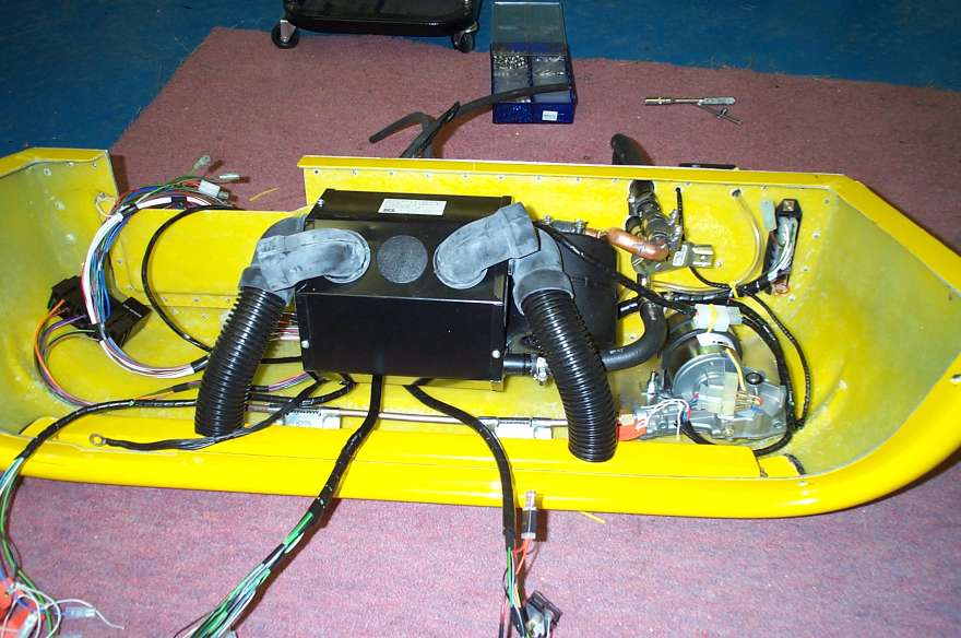 Another visit to Dax this week produced the clutch master cylinder kit, wiper motor, dash board and the SVA bars. The clutch master fitted easily but required a small amount of “adjusting” to the pedal where the yoke fits into it so that it moved freely. The wiper mechanism was assembled first to make sure the holes were made in the correct place and the tube between the wheel box and wiper motor required a small bend so the wiper motor cleared the air distribution duct for the demisters. The wheel boxes were tight against it though. With the holes carefully cut in the scuttle the wipers were assembled, the locating plate for the wiper motor and the air distribution duct were stuck into place with Wurth and left to dry overnight. The dash board required some small amount of trimming to fit well, and then this was trial fitted to check the alignment of the steering column. This showed that the steering wheel required going back a few millimeters so the switches cleared the dash, and a couple of millimeters to the centre. This was much better than I could hope for and the small adjustments were easily made. Then it was time to tackle a job I had been putting off for some time, the ali piece for the foreword part of the scuttle that is under the bonnet needed careful trimming to fit. As it turned this was not as hard as I expected, and with a bit of help from a jig saw and a lot of help from a file was fitting quite well. My son gave me a hand riveting this in place, we both agreed we not going to use as many rivets as Dax used in their demonstrator. This meant the heater could be fitted for hopefully the last time, the washer jet was fitted first and despite having 5mm more clearance the suggested in the manual between the underside of the scuttle and the heater the washer tubing has quite a sharp bend in it, still it does not seem blocked so I will have to see how it works.