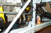 The third attempt at finding an alternator belt was successful and the alternator bolted into place. The instruments I ordered from Merlin Motor sport came this week, I ordered from them because they supplied my remote oil filter kit with new pump cover and should know the thread sizes are required (and their prices seem quite reasonable). This worked as well as I hoped and the 20 lbs per square inch pressure switch, temperature transmitter and connection for the pressure gauge fitted correctly, that’s three more holes filled up! Now to have a look at some wiring, I had put off for months the decision on where to take the front harness through to the cockpit, I finally decide to the left of the clutch pedal as high as I could get it, the hole was cut and after a lot of pain (scraped hands it restricted space) the harness was threaded through with the pipe for the oil pressure gauge. The ends were then put on the harness, no changing of mind now as the harness can’t get through the hole with its plugs in place! The Dax harness has a plug either side of the car at the front, they are identical and you just connect things like water temperature transmitter, oil pressure switch, alternator and starter solenoid to the plug nearest. This worked very well and it did not take long get most things connected, still not sure if more than the 2 connections to the alternator as shown in the wiring instructions are needed, or how to wire up the distributor, may have to get some help here. While I was connecting things the reverse light switch wires were repaired and connect to the rear harness (after checking to make sure the switch worked). The route for the main power cable to from the battery to the harness was worked out so that it was kept out of sight as much as possible, and some spiral wrap wound around it for extra protection. The main fixing holes in the scuttle were drilled, then marked on the chassis and drilled. The scuttle was refitted but the bolts not tightened down as the side panel have to be fitted yet. Time to trim the supply pipes for the master cylinders and connect them before I called it a day. |
